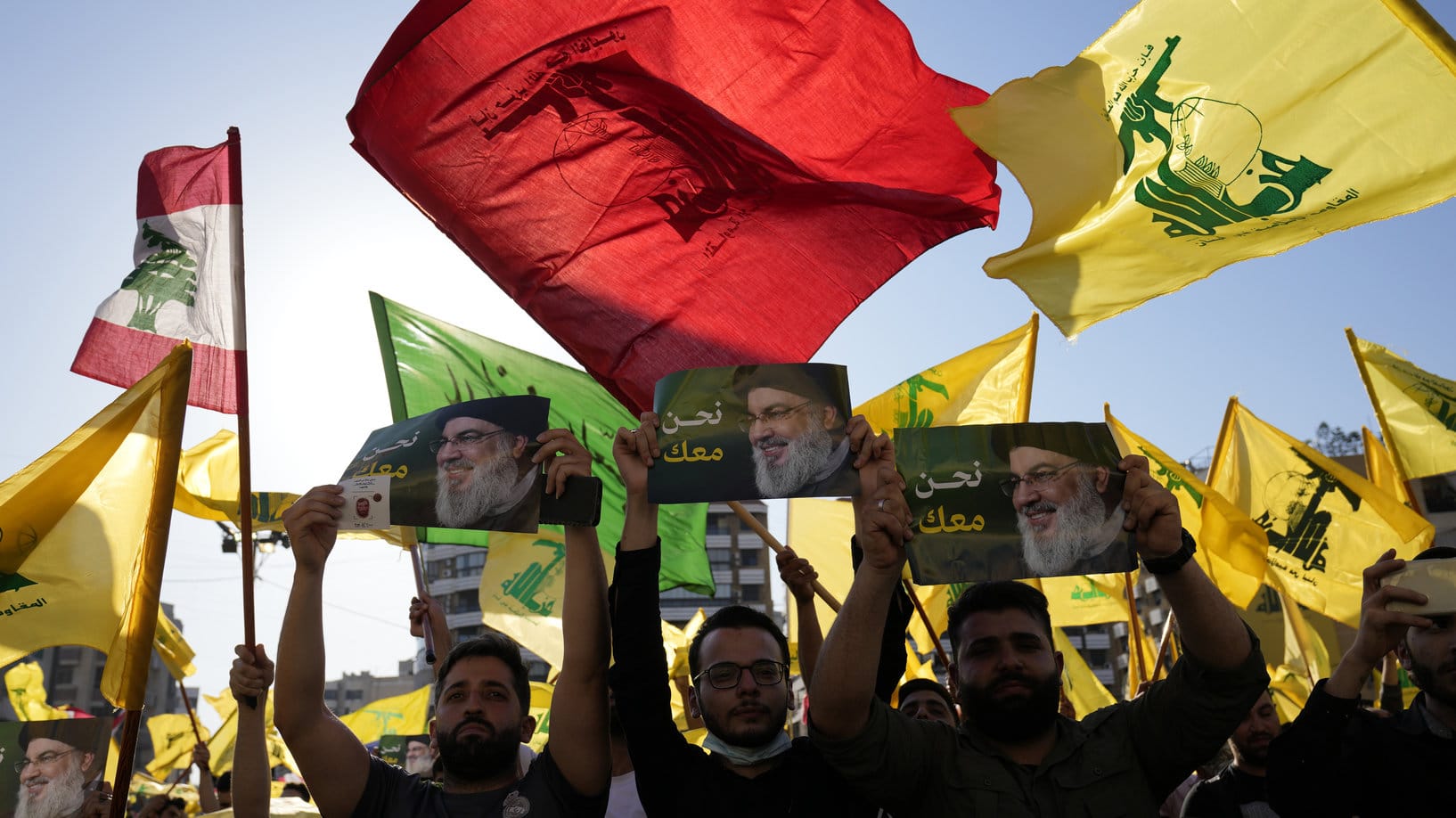 Hezbollah supporters hold up portraits of Hezbollah leader Sayyed Hassan Nasrallah with Arabic words read: "We are with you," as other wave their group flags during an election campaign, in the southern suburb of Beirut, Lebanon, Tuesday, May 10, 2022. Despite a devastating economic collapse and multiple other crises gripping Lebanon, the culmination of decades of corruption and mismanagement, the deeply divisive issue of Hezbollah's weapons has been at the center of Sunday's vote for a new 128-member parliament. (AP Photo/Hussein Malla)